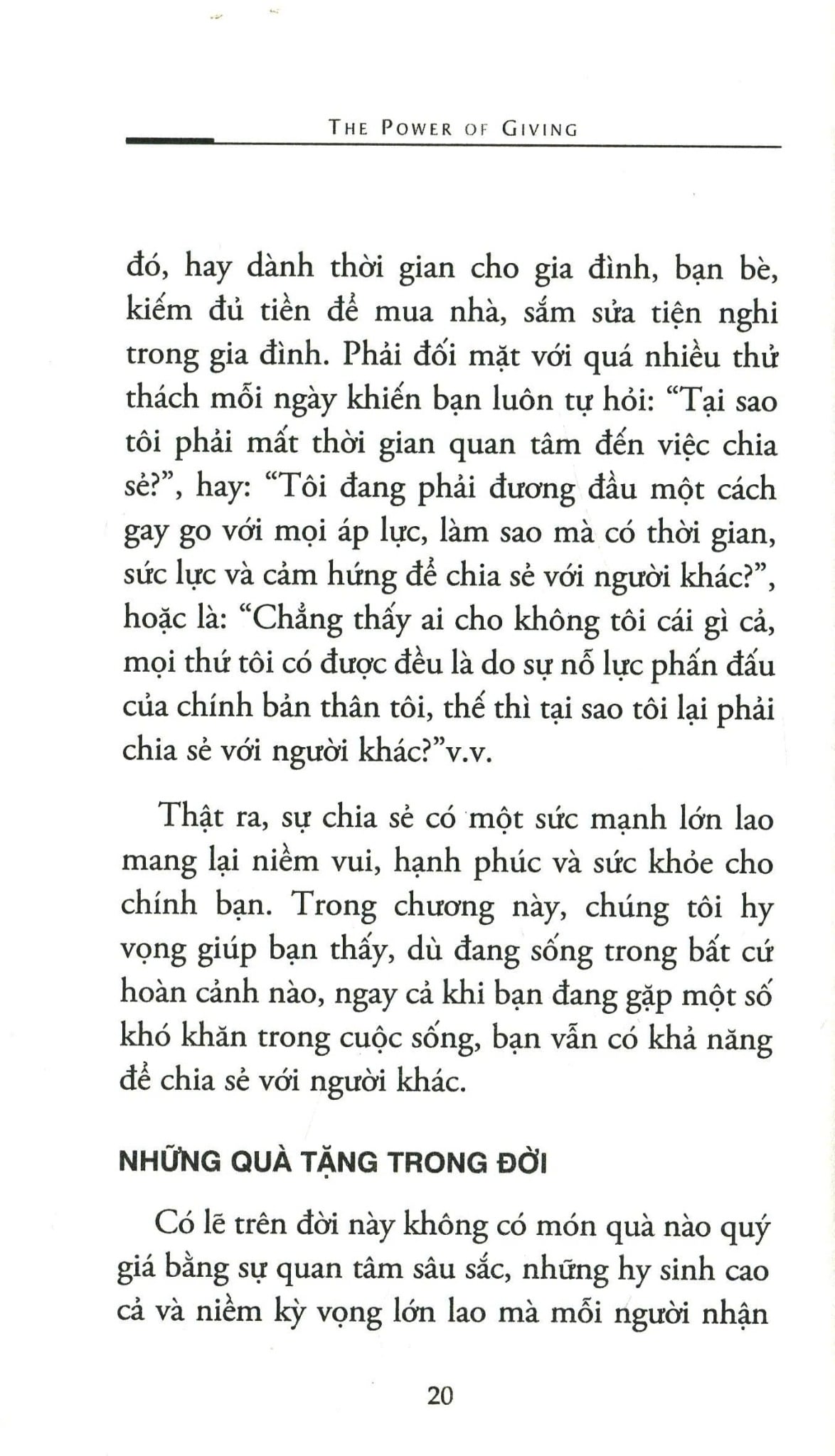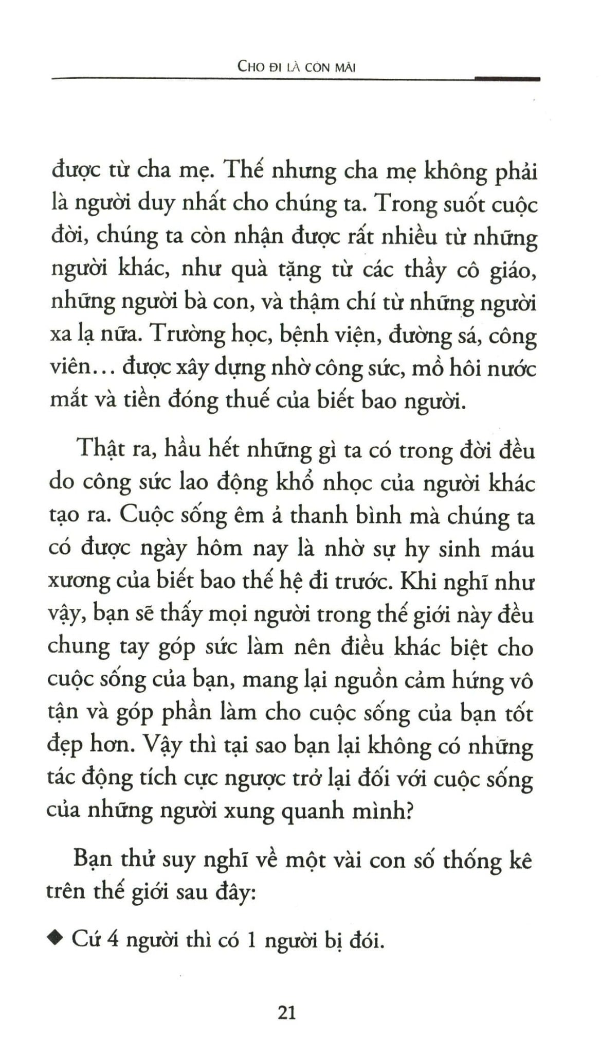 Bản thân mỗi người chúng ta có thể ban tặng chính mình một điều gì đó và cũng có thể nhận lại một điều gì đó từ chính mình. Khi chúng ta có sự chia sẻ và quan tâm lẫn nhau thì cả người trao lẫn người nhận đều có được những tặng phẩm quý giá nhất của cuộc đời. Sự chia sẻ này góp phần làm cho nhân cách mỗi cá nhân trở nên hoàn thiện hơn. Những hành động cao cả sẽ đọng mãi nơi ký ức tốt đẹp của bạn bè, gia đình và xã hội, còn niềm đau sẽ vơi đi và dần bị lãng quên theo lớp bụi thời gian. Sự chia sẻ luôn mang lại niềm vui, hạnh phúc, sức khỏe, và thậm chí là cả sự sống cho con người. Chỉ cần thật tâm, bạn sẽ không bao giờ cảm thấy mất đi khi chia sẻ những gì mình có, bởi vì cho đi là còn mãi! Với quyển sách này, chúng tôi hy vọng sẽ truyền cảm hứng, khơi dậy niềm khát khao chia sẻ trong bạn, thắp sáng niềm tin nơi tâm hồn bạn, để bạn tiếp tục trao tặng những điều tốt đẹp cho cuộc sống nhiều hơn nữa. Và chúng tôi tin tưởng mãnh liệt rằng: Một khi bạn cho đi, chính là lúc bạn được nhận lại!