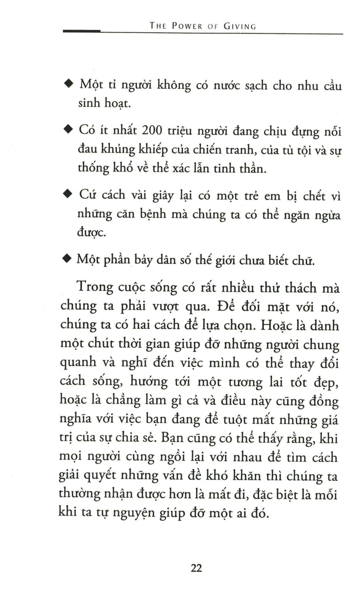Cuộc sống là quá trình trao tặng và đón nhận không ngừng, mỗi người chúng ta là một mắc xích quan trọng trong vòng liên kết ấy. Vì vậy, đừng do dự khi mở rộng lòng mình với mọi người. Rất nhiều người, nhiều nơi trên thế giới đang chờ đợi ở bạn một sự hảo tâm, một vòng tay ấm áp. Đôi khi, chỉ một ánh mắt trìu mến, một nụ cười thân thiện, hay một câu nói chân tình cũng đủ làm viên mãn một trái tim! Hãy cho đi để thấy rằng đời sống thật phong phú.