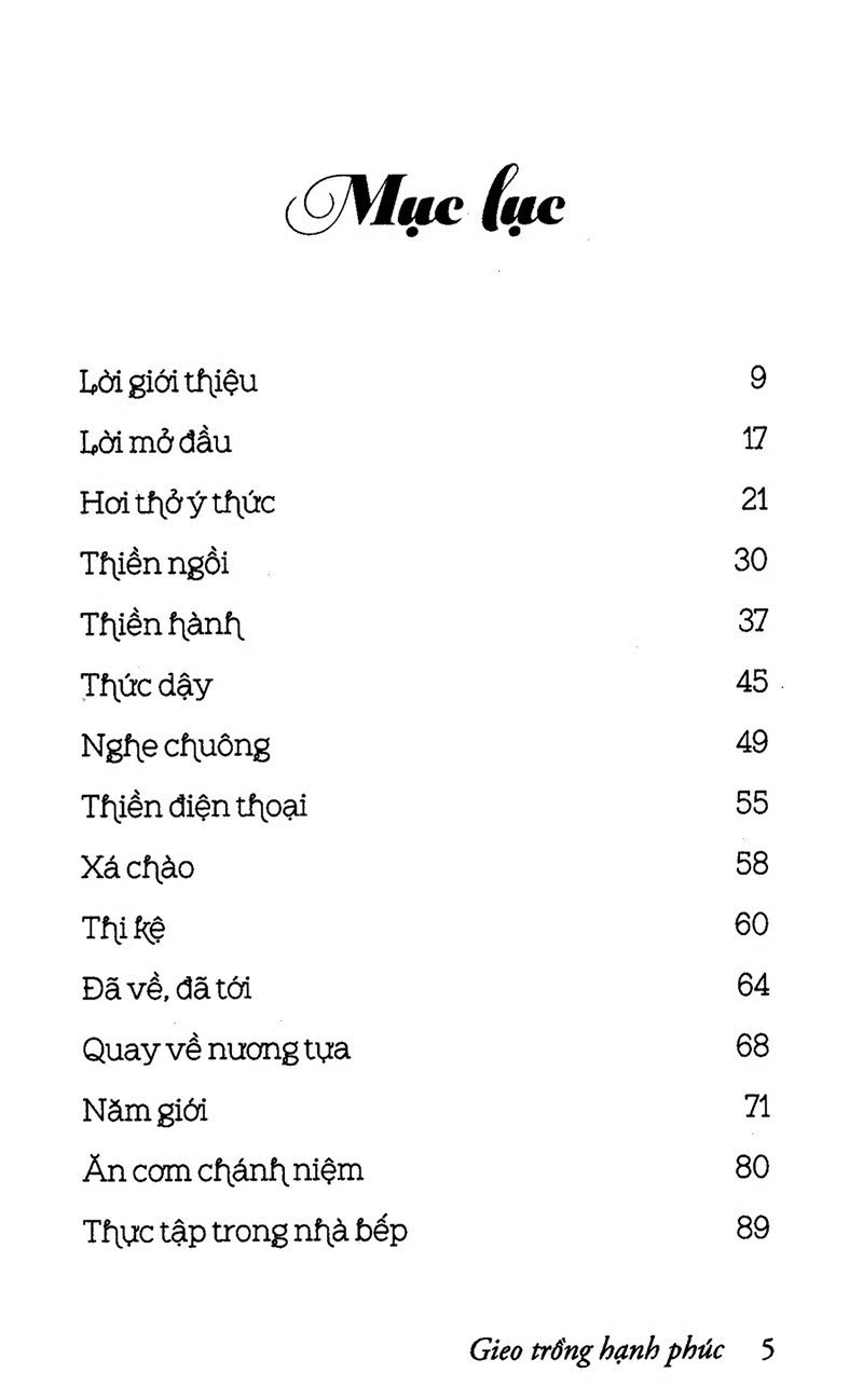 Để thưởng thức trọn vẹn những món quà mà cuộc sống ban tặng, chúng ta phải thực tập chánh niệm trong mọi lúc, mọi nơi dù đang đánh răng, chuẩn bị thức ăn sáng hay lái xe đi làm. Mỗi bước chân, mỗi hơi thở có thể là một cơ hội đem đến cho ta niềm vui và hạnh phúc. Cuộc sống đầy dẫy khổ đau. Nếu không đủ hạnh phúc, ta sẽ không chăm sóc được nỗi khổ đau và tuyệt vọng của mình. Chúng ta hãy thực tập với tinh thần nhẹ nhàng thư thái, với tâm hồn rộng mở bao la và với một trái tim sẵn sàng lắng nghe, chấp nhận. Thực tập là để nuôi lớn hiểu biết chứ không phải để phô trương hình thức. Có chánh niệm, ta có thể nuôi lớn được niềm vui trong ta, giúp ta xử lý tốt hơn những khó khăn thách thức trong cuộc sống và biết cách chế tác tự do, an lạc, thương yêu trong mỗi chúng ta.
