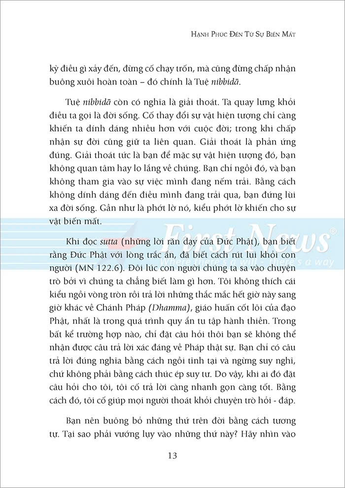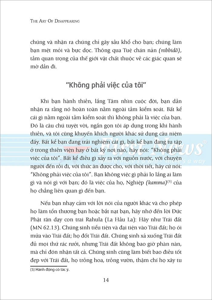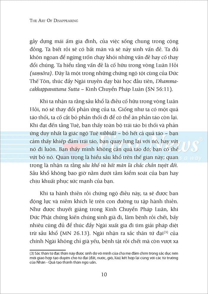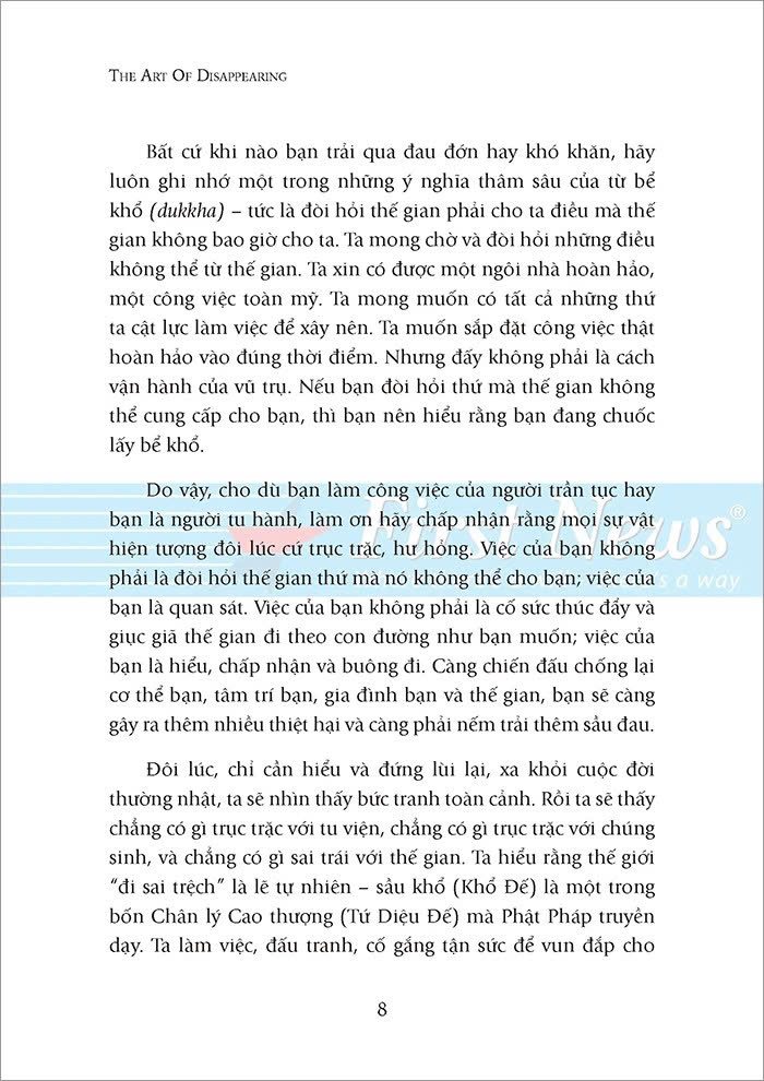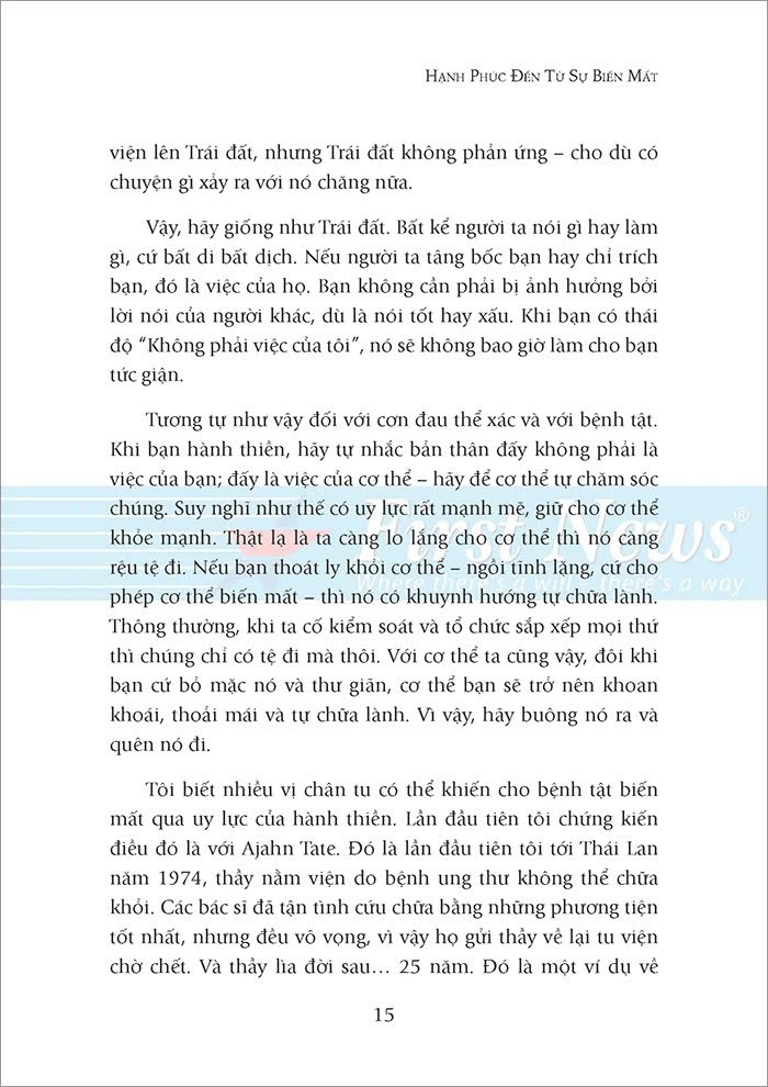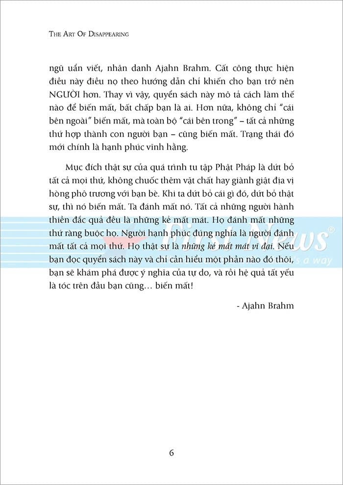 Đó là vì ta thường nghĩ đến mình và sợ mất đi những thứ “của mình”. Đối với Ajahn Brahm, chìa khóa để mở cánh cửa hạnh phúc vĩnh hằng và bình an chính là buông bỏ. Biến mất là dứt bỏ tất cả mọi thứ, không chuốc thêm vật chất hay giành giật địa vị. Khi ta dứt bỏ cái gì đó, dứt bỏ thật sự thì nó biến mất. Đó là sự biến mất từ trong ra ngoài, sự biến mất của cái tôi – bản ngã. Dứt bỏ cái tôi thì ta dứt bỏ được tất cả phù phiếm, ảo ảnh bên ngoài; dứt bỏ được những nỗi đau, lo lắng thua thiệt đi kèm nó. Từ đó, ta tìm được bình yên thực sự, tìm được niềm hạnh phúc bất diệt.