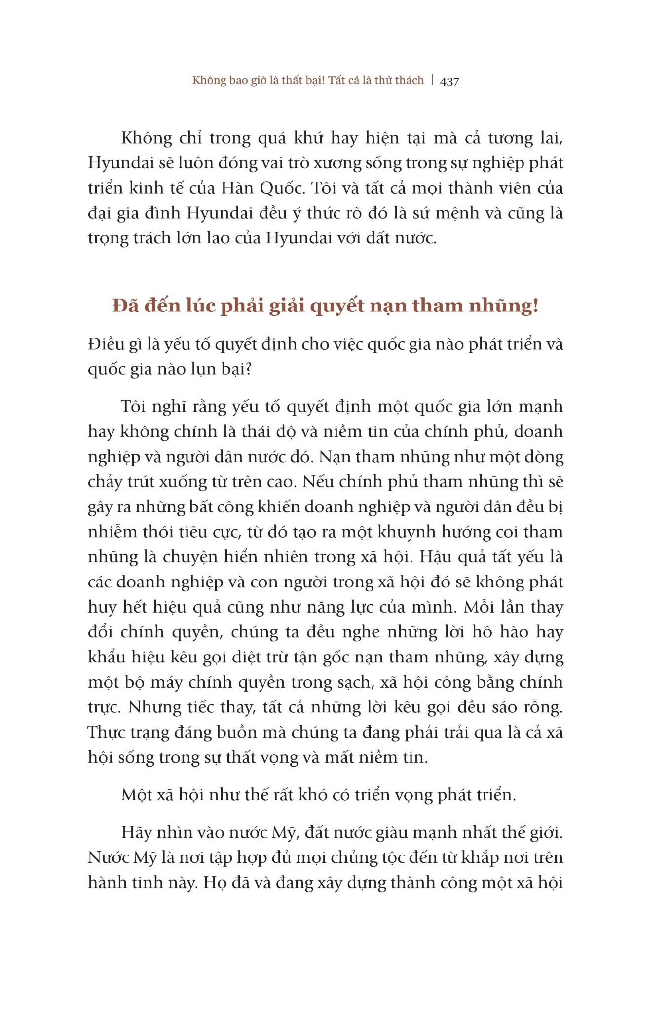 Không bao giờ là thất bại, tất cả là thử thách” thuật lại chi tiết cuộc đời và sự nghiệp của cố chủ tịch Chung Ju Yung qua từng giai đoạn thăng trầm. Đây là quyển sách gối đầu giường của rất nhiều thế hệ doanh nhân vì chứa đựng trong nó, không chỉ là hành trình và kinh nghiệm của người sáng lập nên một trong những thương hiệu nổi tiếng nhất thế giới mà còn có những bài học ấn tượng về quản trị, kinh doanh cũng như đạo làm người.