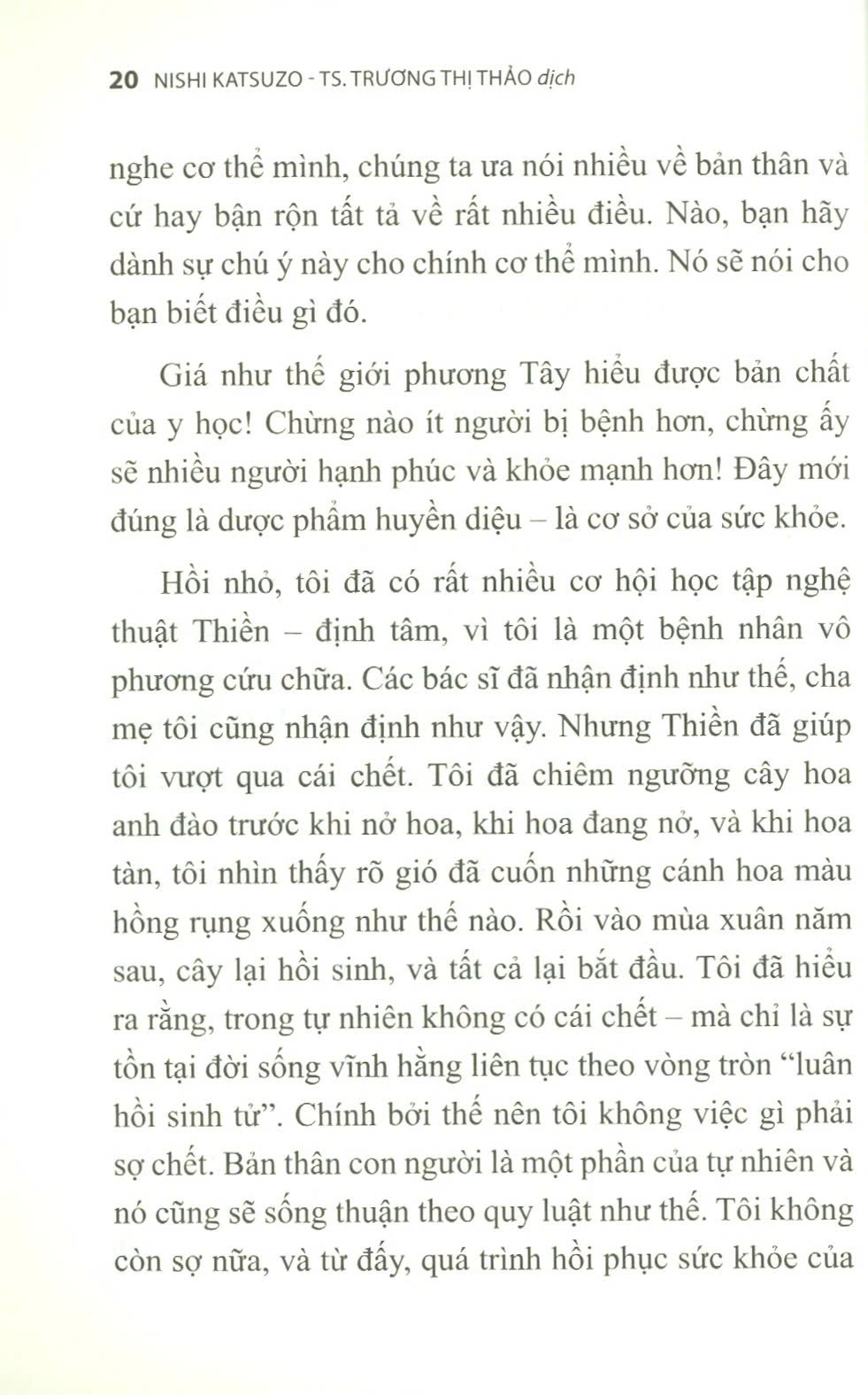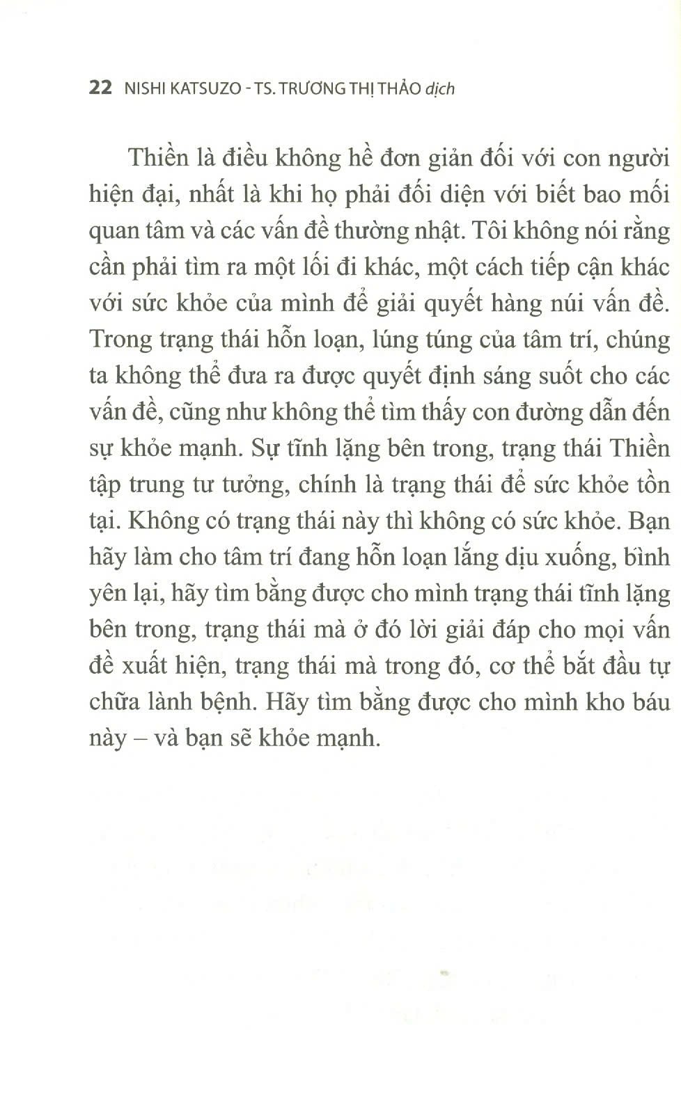 Có thể nói rằng, sự phục hồi sức khỏe của tôi bắt đầu từ khả năng thấu hiểu sự thật về các quy luật đích thực của thế giới, của vũ trụ và của tự nhiên. Tác giả đã thấu hiểu điều ấy thông qua Thiền, chỉ trong Thiền. Qua Thiền, Nishi Katsuzo nắm được các bí mật của cơ thể mình, lắng nghe những lời giải đáp của nó đối với các vấn đề của chính mình – và ông đã tìm được những phương pháp đúng đắn đích thực để chữa bệnh, điều mà bản thân ông rất cần. Tác giả đã tìm ra con đường này và những phương thuốc chữa lành bệnh không phải từ trong sách, cũng không phải từ các cuộc hội thảo của các nhà bác học vĩ đại mà đã tìm ra chúng từ bên trong bản thân mình nhờ nghệ thuật Thiền tập trung tư tưởng.