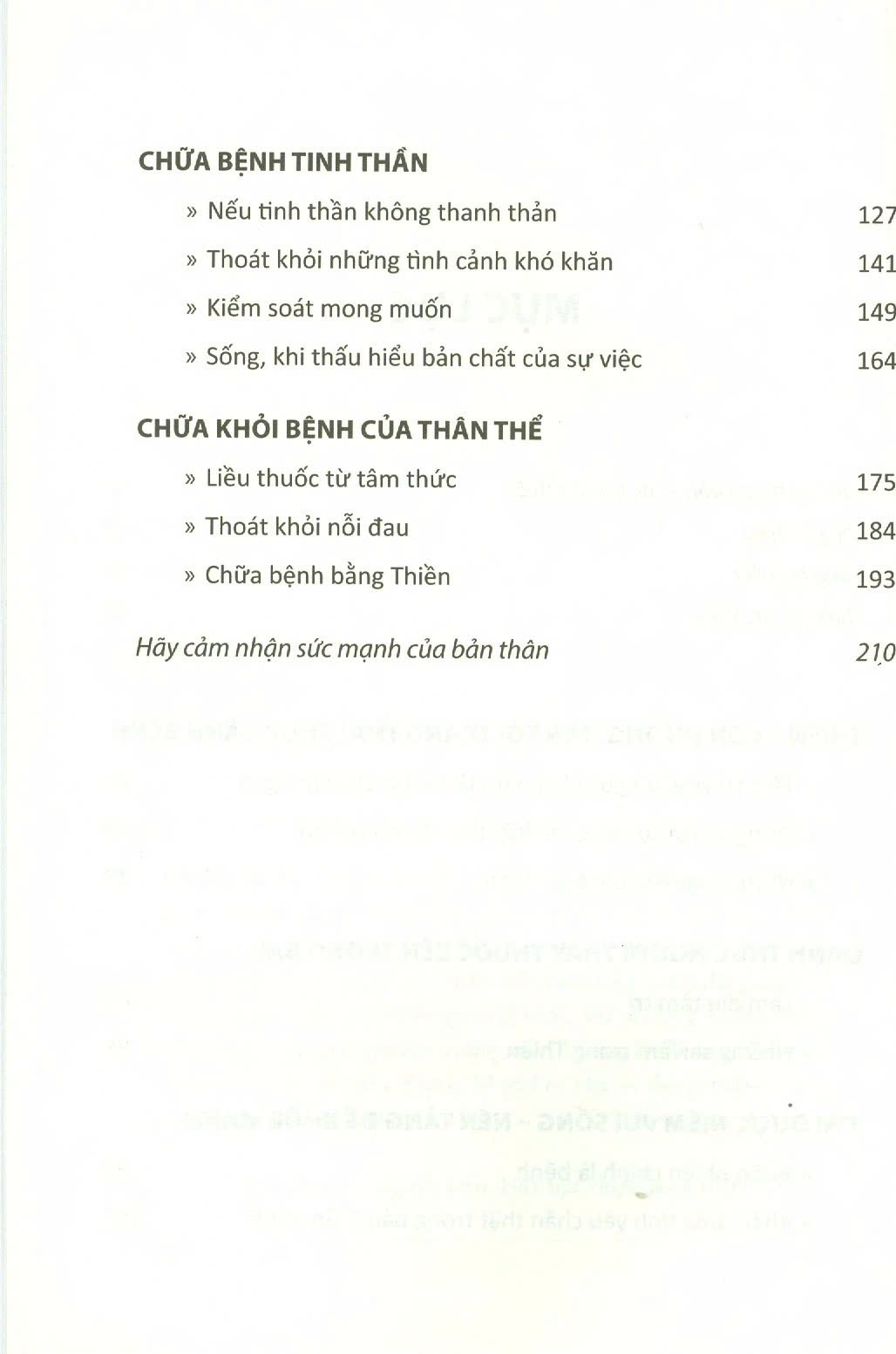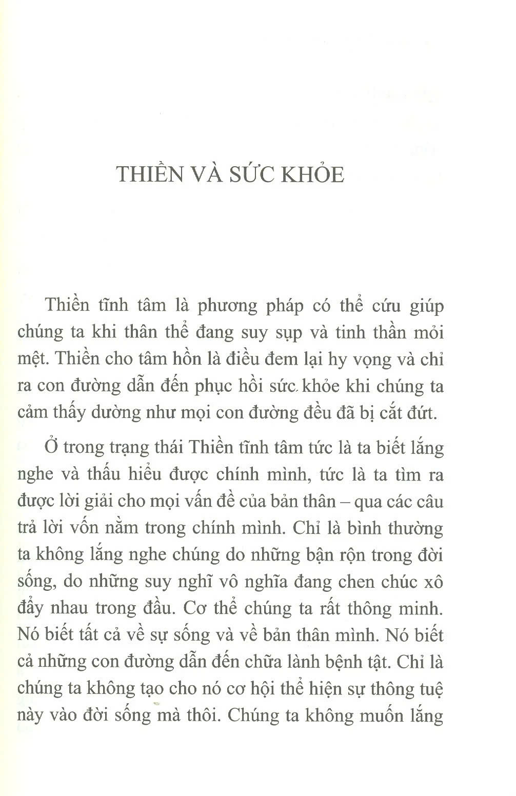 Thiền là điều không hề đơn giản đối với con người hiện đại, nhất là khi họ phải đối diện với biết bao mối quan tâm và các vấn đề thường nhật. Tác giả không nói rằng cần phải tìm ra một lối đi khác, một cách tiếp cận khác với sức khỏe của mình để giải quyết hàng núi vấn đề. Trong trạng thái hỗn loạn, lúng túng của tâm trí, chúng ta không thể đưa ra được quyết định sáng suốt cho các vấn đề, cũng như không thể tìm thấy con đường dẫn đến sự khỏe mạnh. Sự tĩnh lặng bên trong, trạng thái Thiền tập trung tư tưởng, chính là trạng thái để sức khỏe tồn tại. Không có trạng thái này thì không có sức khỏe. Bạn hãy làm cho tâm trí đang hỗn loạn lắng dịu xuống, bình yên lại, hãy tìm bằng được cho mình trạng thái tĩnh lặng bên trong, trạng thái mà ở đó lời giải đáp cho mọi vấn đề xuất hiện, trạng thái mà trong đó, cơ thể bắt đầu tự chữa lành bệnh. Hãy tìm bằng được cho mình kho báu này – và bạn sẽ khỏe mạnh.