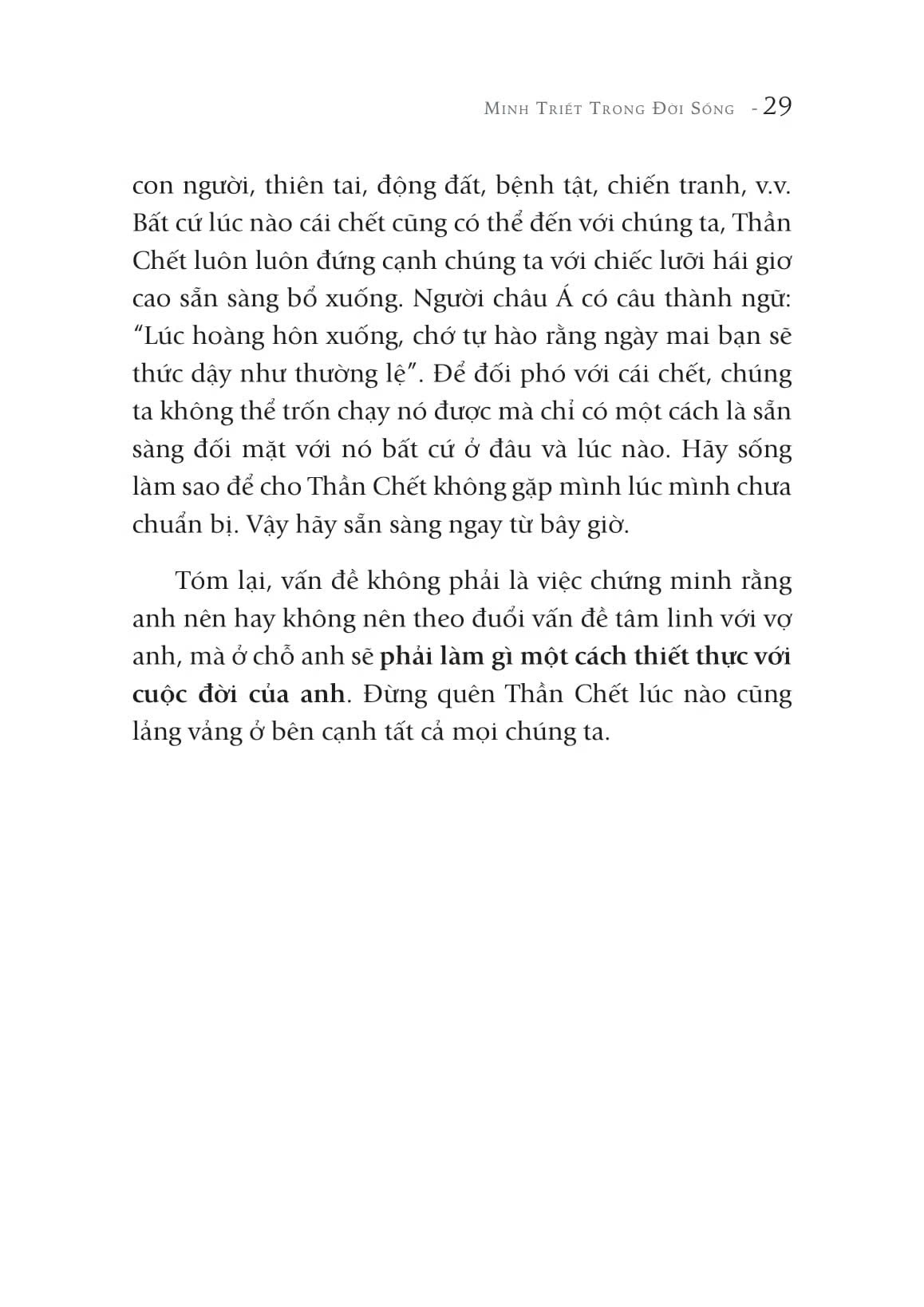 Từ những kinh nghiệm của các bậc thầy tâm linh thế giới và trải nghiệm của bản thân, tác giả - diễn giả nổi tiếng Darshani Deane sẽ giải đáp những trăn trở ấy và rất nhiều vướng mắc khác qua 58 chủ điểm trong quyển sách này. Tác phẩm nổi tiếng Minh triết trong đời sống sẽ khơi mở tâm trí, giúp chúng ta con đường vượt khỏi những vướng mắc trói buộc tâm tưởng để đạt đến cảm giác an nhiên trong đời sống.