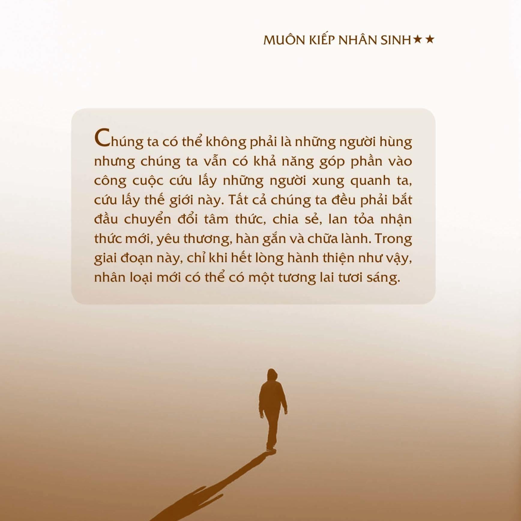Nếu chúng ta có thể cùng nhauchuyển hoá những tư tưởng thù hận, tham lam, íchkỷ bằng những tư tưởng cao thượng, tốt lành; chuyểnhóa các hành động hận thù, giết chóc bằng tình thươngyêu rộng lớn thì mọi việc có thể thay đổi” – trích Muôn Kiếp Nhân Sinh tập 2.