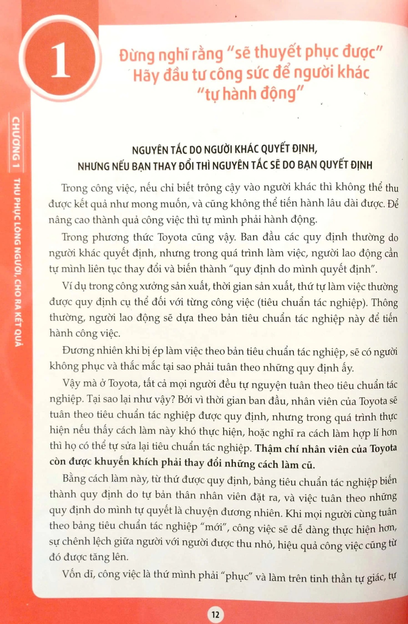 Nói đến phương thức Toyota, chúng ta thường liên tưởng tới công xưởng sản xuất, nhưng thực ra phương thức này có thể áp dụng cho tất cả các bộ phận, từ nghiên cứu, phát triển sản phẩm, kinh doanh, bán hàng, cho đến cả các bộ phận gián tiếp trong công ty. Cuốn sách này sẽ tập trung giới thiệu các ví dụ thực tiễn về cách thức áp dụng phương thức Toyota trong khâu nghiên cứu, bán hàng và các bộ phận gián tiếp, được đúc rút trong suốt quá trình xây dựng và trưởng thành của hãng, từ đó cung cấp cho độc giả những bài học quý báu về cách làm việc hiệu quả theo phương thức Toyota. Thông qua cuốn sách, độc giả sẽ hiểu thêm nhiều điều về một trong những hãng xe hơi hàng đầu thế giới, cũng như cách nghĩ, cách làm đã giúp họ vượt qua vô vàn khó khăn, thử thách để làm nên một hãng xe đình đám như ngày hôm nay.
