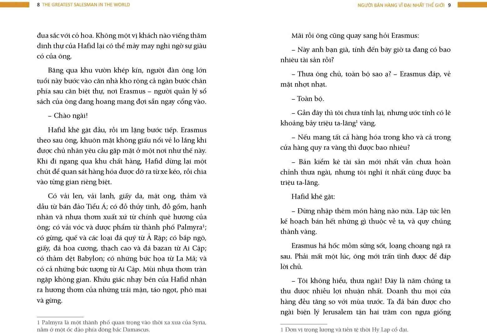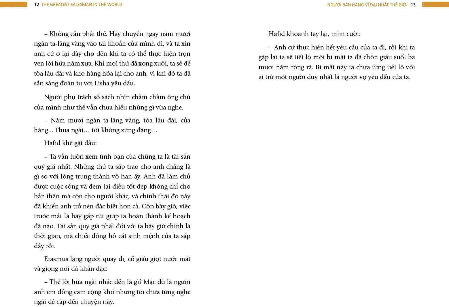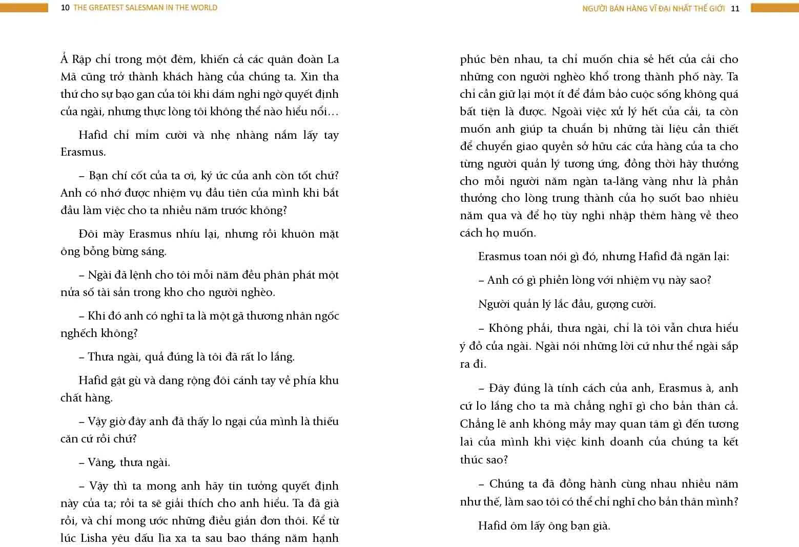 Bí mật nào đã làm nên thành công? Đó chính là những nguyên tắc được một thương nhân giàu có và thành công truyền lại và Hafid đã giữ kỹ trong 10 cuộn giấy da trong suốt hơn ba thập kỉ qua. Với Hafid, những thứ giản dị này còn quý hơn cả kim cương. Nhờ áp dụng những nguyên tắc trong cuộn giấy da đó mà Hafid được mệnh danh là “Người bán hàng vĩ đại nhất thế giới”. Tuy nhiên, sách không chỉ dạy bạn cách “bán hàng”, mà nó còn là một cuốn sách dạy bạn làm người, giúp bạn trở thành người “vĩ đại nhất” trong lĩnh vực mà bạn chọn.