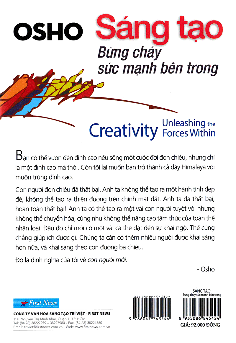 Bạn đọc Việt Nam đã yêu thích với quyển sách Hạnh Phúc Tại Tâm (JOY: The Happiness That Comes from Within) của tác gia Osho do First News xuất bảnvà đánh giá rất cao. Không chỉ vậy, quyển sách còn trở thành người bạn đồng hành trong cuộc sống. Và giờ đây, bạn đọc chắc chắn sẽ tìm được nhiều cảm hứng với quyển sách Sáng Tạo – Bừng Cháy Sức Mạnh Bên Trong (Creaty Unleashing The Fores Within).