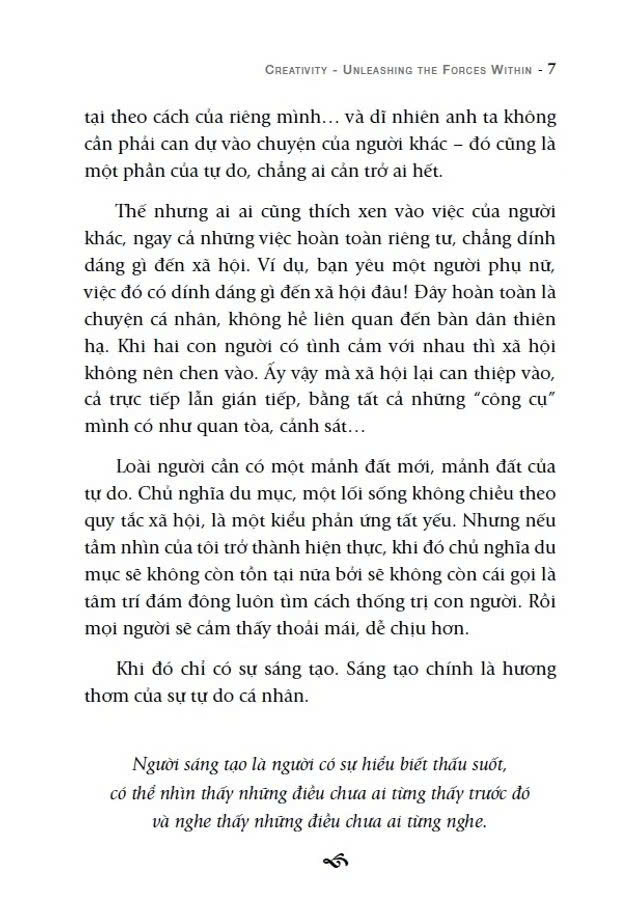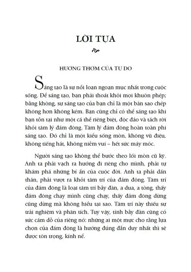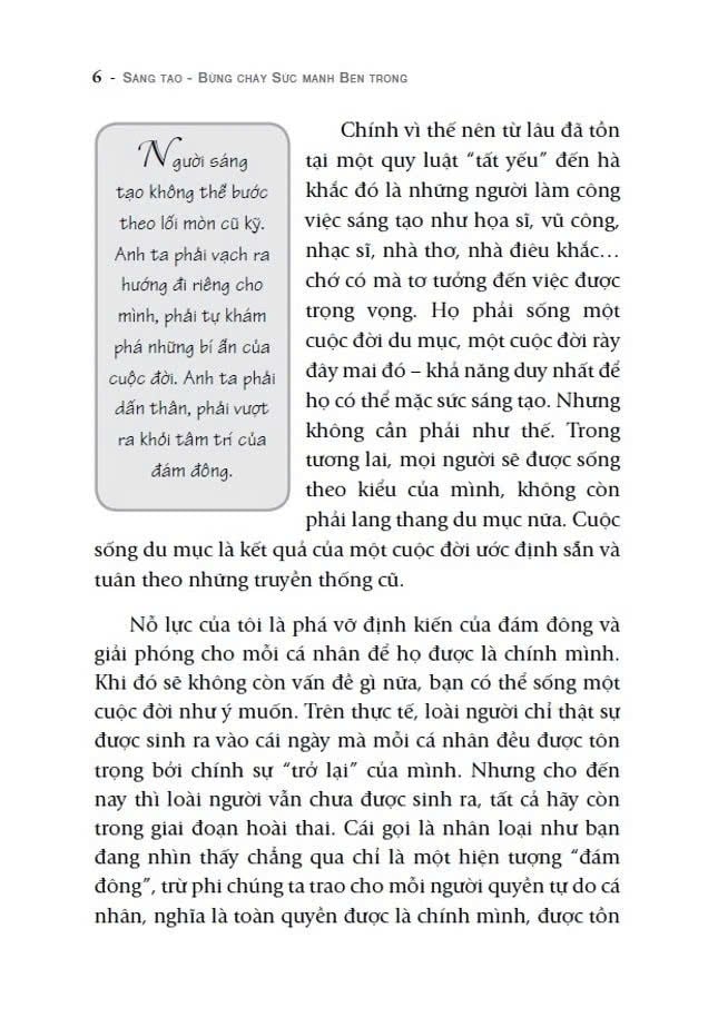 Người sáng tạo không thể bước theo lối mòn cũ kỹ. Anh ta phải vạch ra hướng đi riêng cho mình, phải tự khám phá những bí ẩn của cuộc đời. Anh ta phải dấn thân, phải vượt ra khỏi tâm trí của đám đông. Tâm lý đám đông cũng có sức cám dỗ của riêng nó: những ai một mực cho rằng lựa chọn của đám đông là hướng đúng đắn duy nhất thì sẽ được tôn trọng, kính nể.