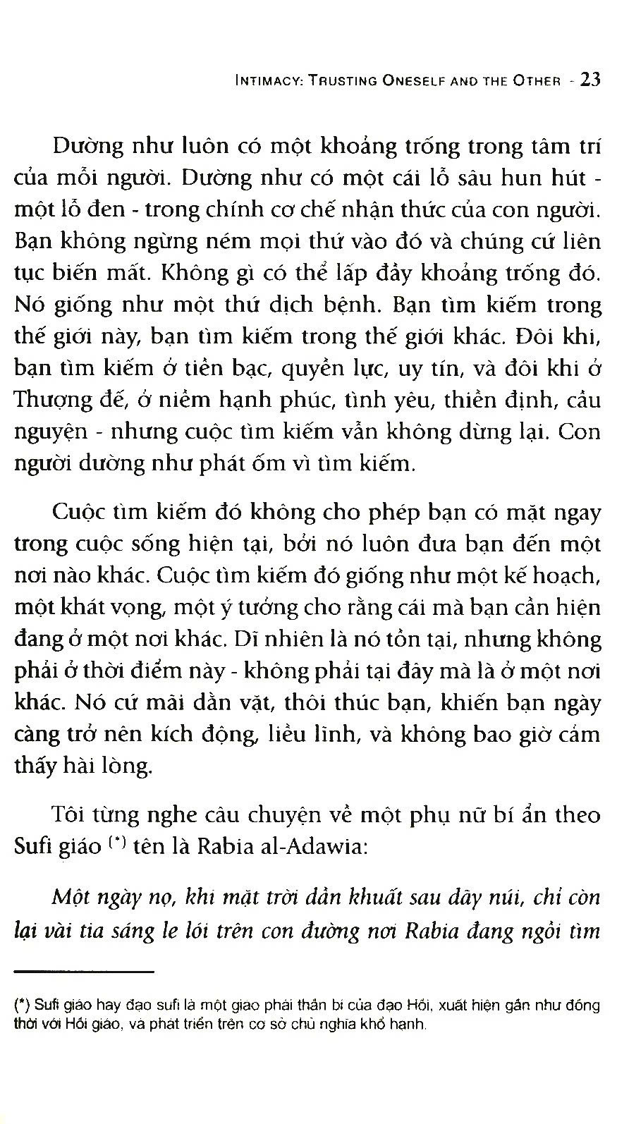 Nhưng vấn đề càng trở nên phức tạp hơn bởi không ai muốn xa cách. Mọi người đều muốn thân mật với người khác bởi nếu không, họ sẽ trở nên lạc lõng giữa thế giới rộng lớn này – không bạn bè, không người thương yêu, không một ai để tin cậy, để cởi mở tấc lòng và phô ra những vết thương âm ỉ. Vết thương không thể lành da, trừ phi bạn gỡ khỏi nó mọi thứ bưng bít, che đậy. Bạn càng che giấu, vết thương càng trở nên nguy hiểm, thậm chí có thể gây chết người. Thế nhưng, mọi người lại ngại thân mật – bạn muốn thân mật với người khác nhưng vẫn không muốn từ bỏ “chiếc áo giáp sắt” của mình. Đây là một trong những điểm đối lập giữa bạn bè, giữa những người yêu: Không ai muốn từ bỏ lớp rào chắn bảo vệ, và không ai muốn cởi mở hay chân thành tuyệt đối – tuy nhiên cả hai đều mong mỏi sự thân mật. Do đó, bạn phải là người khởi xướng. Bằng sự gần gũi và tình yêu, bằng cách cởi mở với nhiều người khác, bạn sẽ càng trở nên giàu có. Và nếu có thể sống trong tình yêu sâu sắc, trong tình bạn bền chặt, trong sự gần gũi thân thiết với nhiều người, tức là bạn đã có một cuộc sống đúng nghĩa. Và cho dù ở đâu, bạn đều học được cách sống và sống hạnh phúc.