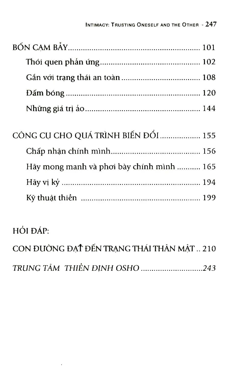 Thân mật có nghĩa là mọi cánh cửa của trái tim đều mở ra chào đón bạn: bạn được mời vào và được đón tiếp như một vị khách. Nhưng điều đó chỉ xảy ra nếu bản năng giới tính của bạn không bị đè nén, lòng bạn không sục sôi những điều trụy lạc, và tâm hồn bạn phải thuần khiết. Tự nhiên như cây cỏ, trong sáng như một đứa trẻ - khi đó bạn sẽ không còn ngại thân mật. Thân mật cũng có nghĩa là tin tưởng ở chính mình và người khác.