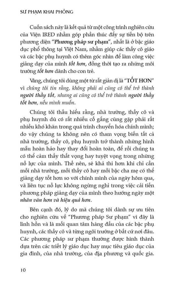 Cuốn sách vừa chia sẻ mô hình giáo dục của tác giả, vừa tổng hợp những phương pháp sư phạm từ cổ chí kim, từ Đông sang Tây, từ thế giới đến Việt Nam, từ triết lý đến chính sách, từ nguyên lý đến phương pháp, từ đó mỗi người có thể tự hình thành nên một phương pháp sư phạm hiệu quả hơn và nhân văn hơn cho riêng mình trong mọi bối cảnh giáo dục; góp phần thúc đẩy sự tiến bộ trên phương diện “Phương pháp Sư phạm” và giúp các thầy cô giáo, các bậc phụ huynh có thêm góc nhìn để làm công việc giảng dạy của mình tốt hơn.