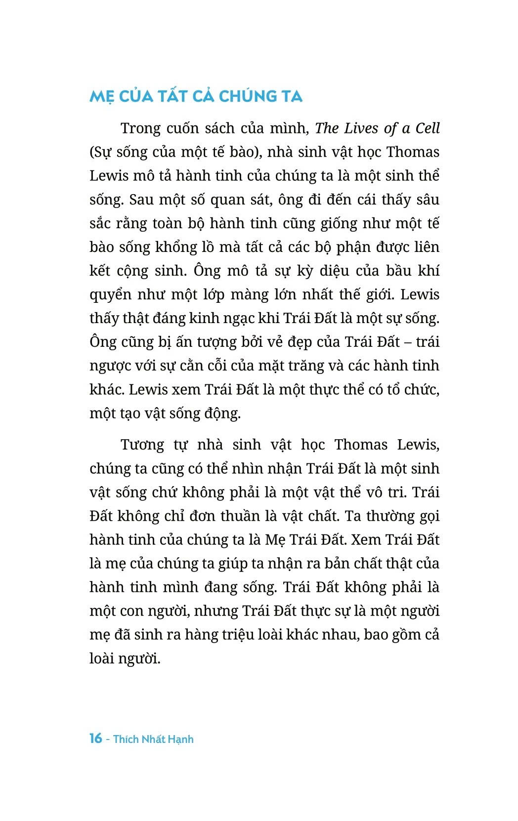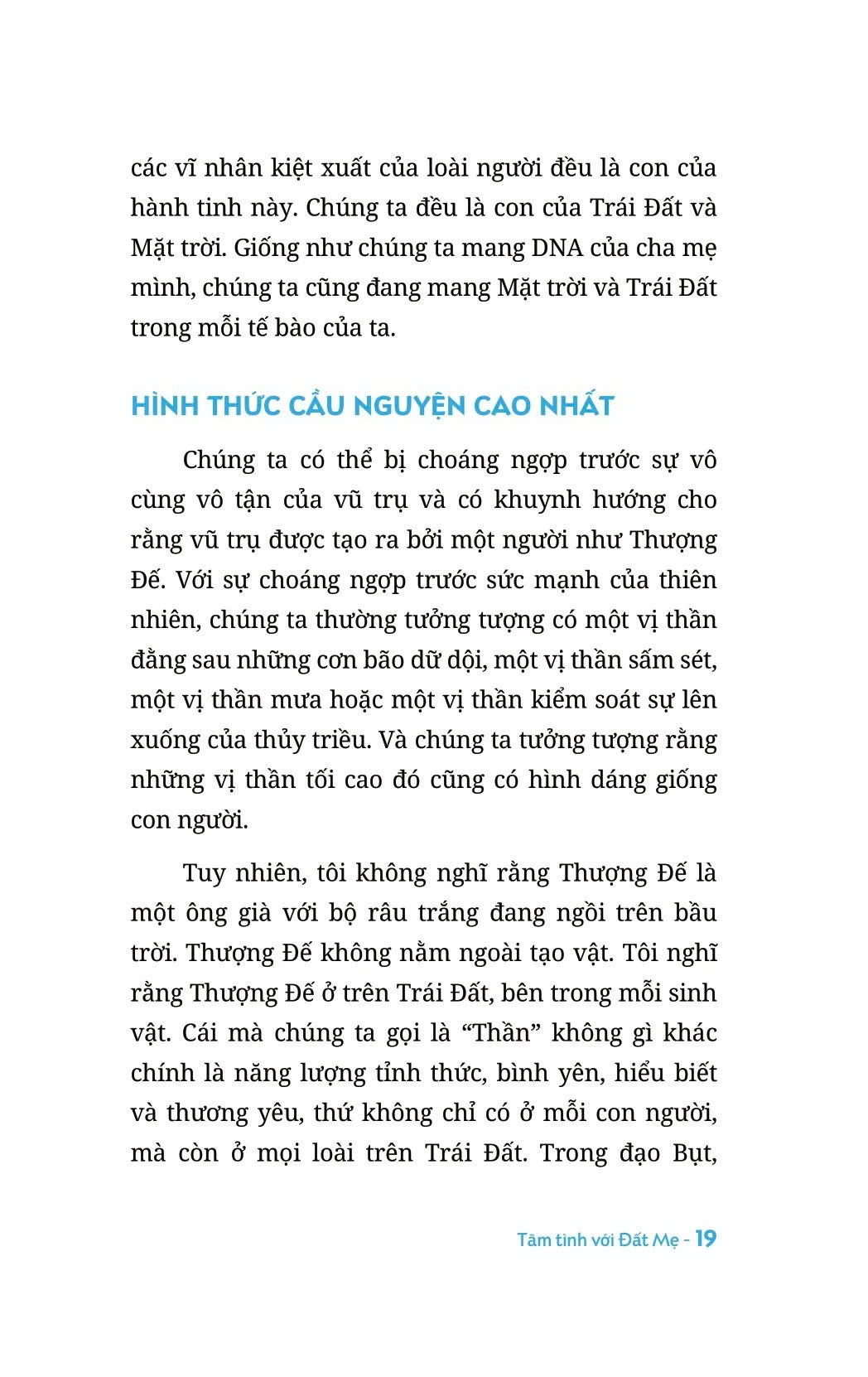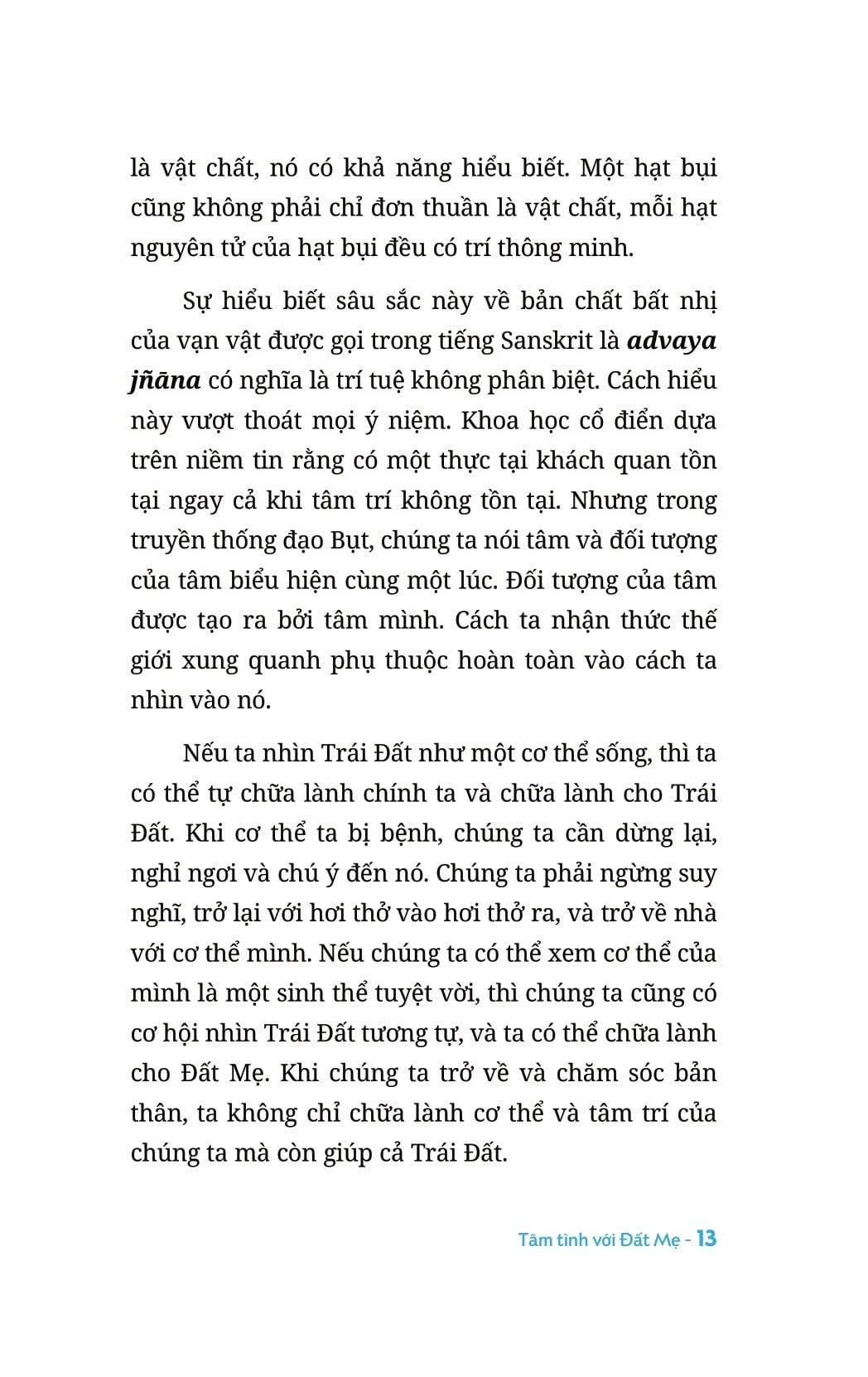 Trong mỗi khoảnh khắc, Đất Mẹ hiện diện bên trên, bên dưới, xung quanh, thậm chí bên trong bản thân bạn. Đất Mẹ có mặt ở khắp mọi nơi. Có lẽ ta từng nghĩ rằng Địa Cầu chỉ là phần bên dưới chân chúng ta mà thôi. Nhưng thật ra, nước, các đại dương, bầu trời cũng như tất cả mọi thứ xung quanh chúng ta đều khởi phát từ Đất Mẹ. Chúng ta cũng thường quên mất rằng hành tinh chúng ta đang sinh sống đã hiến tặng những thành tố cấu tạo nên cơ thể của ta. Ta có nước trong da thịt, trong xương, tất cả những tế bào vi tế trong cơ thể mình đều bắt nguồn và đều là những thành phần của Đất Mẹ. Quả Địa Cầu không chỉ đơn thuần là môi trường mà chúng ta sinh sống. Chúng ta cũng chính là Đất Mẹ và Đất Mẹ luôn luôn có mặt trong chúng ta.