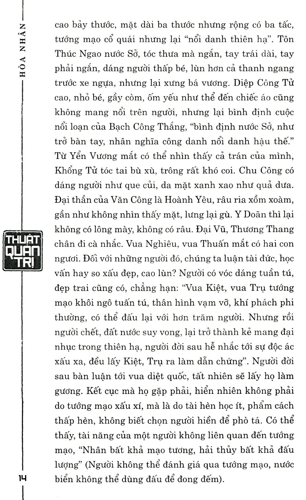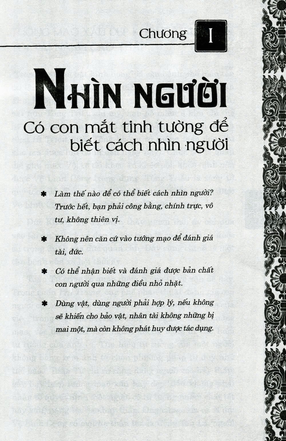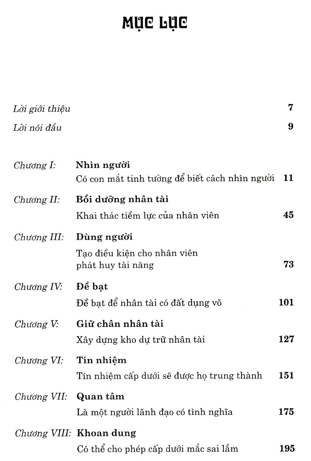Nội dung của Thuật quản trị sẽ giúp bạn có con mắt tinh đời để biết cách nhìn người. Vậy làm thế nào để có thể nhận biết người tốt kẻ xấu? Điều kiện tiên quyết nằm ở việc bạn phải công bằng, chính trực, vô tư, không thiên vị… Người lãnh đạo phải đối diện với một tập thể được cấu thành từ những nhân viên quảy lý cấp trung và nhân viên bình thường. Mục tiêu của tập thể là duy trì sự thống nhất nội bộ và tiếp tục phát triển. Để thực hiện mục tiêu chung đòi hỏi nhà lãnh đạo phải nhận biết và khai thác được năng lực tiềm ẩn của nhân viên, phát huy mặt mạnh của mỗi người, phân công công việc hợp lý, biết tuyển dụng và giữ chân nhân tài…