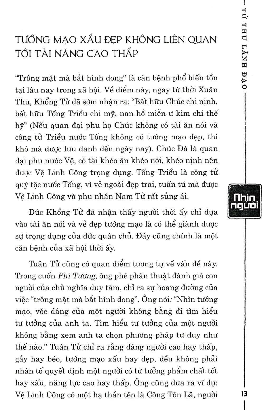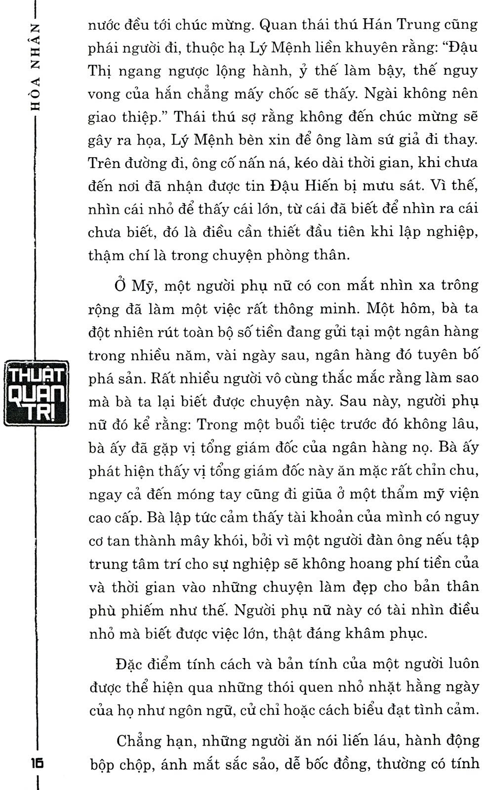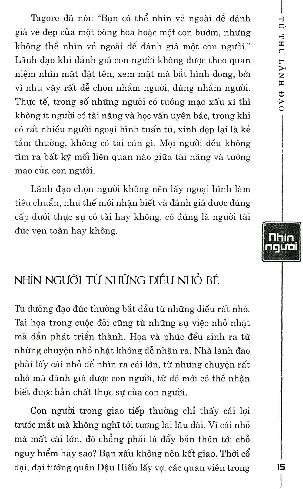 Nội dung của Thuật quản trị sẽ giúp bạn có con mắt tinh đời để biết cách nhìn người. Vậy làm thế nào để có thể nhận biết người tốt kẻ xấu? Điều kiện tiên quyết nằm ở việc bạn phải công bằng, chính trực, vô tư, không thiên vị… Người lãnh đạo phải đối diện với một tập thể được cấu thành từ những nhân viên quảy lý cấp trung và nhân viên bình thường. Mục tiêu của tập thể là duy trì sự thống nhất nội bộ và tiếp tục phát triển. Để thực hiện mục tiêu chung đòi hỏi nhà lãnh đạo phải nhận biết và khai thác được năng lực tiềm ẩn của nhân viên, phát huy mặt mạnh của mỗi người, phân công công việc hợp lý, biết tuyển dụng và giữ chân nhân tài…