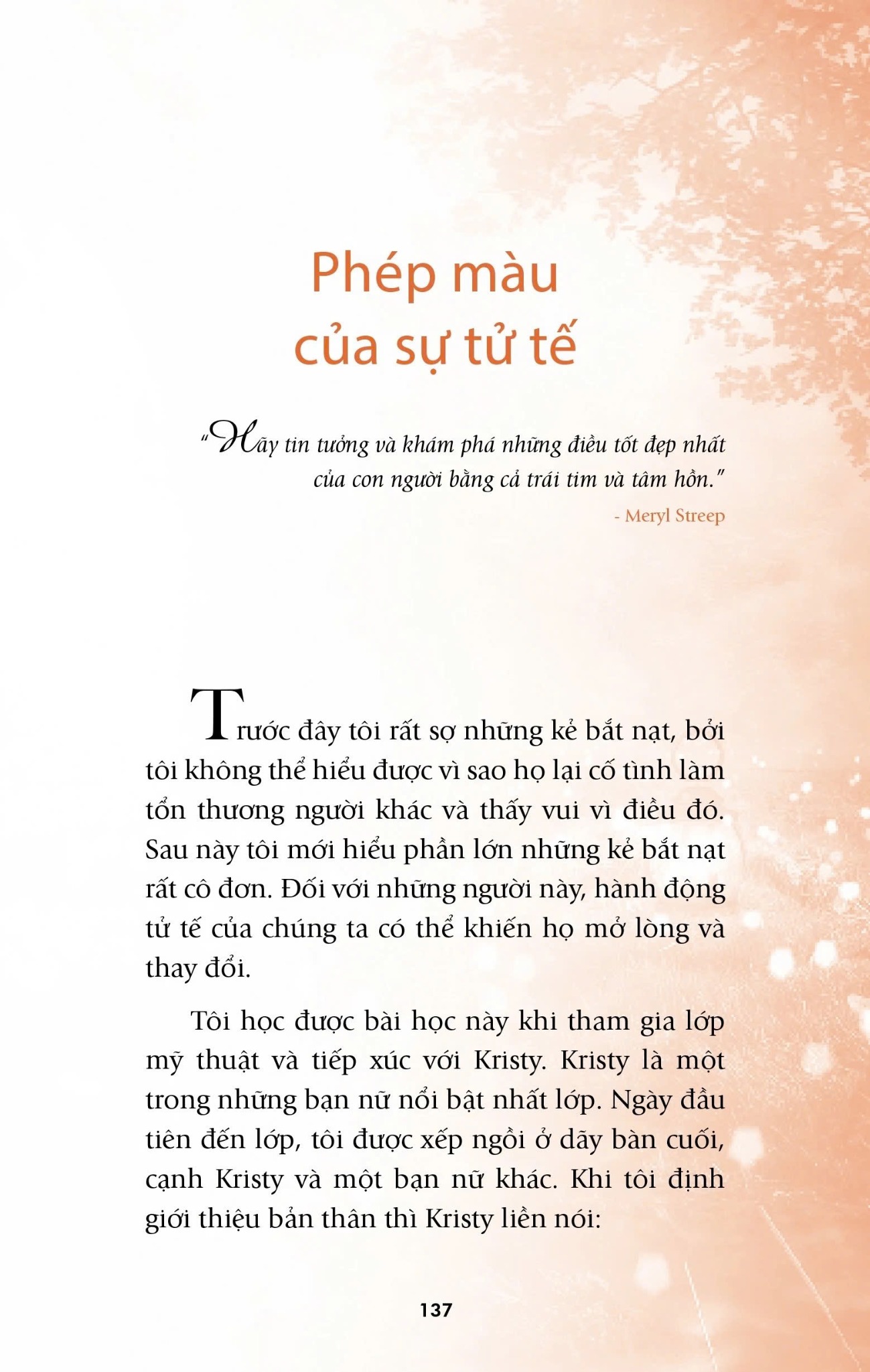 Xuyên suốt cuốn sách, độc giả sẽ cảm nhận một tinh thần đầy lạc quan, thái độ sống giàu lòng yêu thương và sự cảm thông, quan tâm đến người khác, cũng như không bao giờ ngừng hy vọng vào những điều đẹp đẽ trong cuộc sống, bất chấp thử thách hay nỗi đau có thể ghé thăm cuộc đời mình bất cứ lúc nào. Những câu chuyện tuy giản dị nhưng có khả năng truyền động lực và củng cố niềm tin, giúp bạn đọc ghi nhớ bài học quan trọng: “Hãy luôn giữ bên mình ánh sáng của hy vọng và có thái độ sống tích cực”.